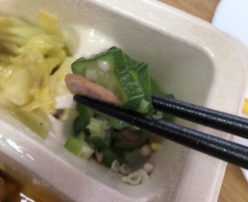 唐揚げの下に入っている野菜にもたっぷりハニーマスタードソースが絡まり、粒マスタードとアーモンド、フライドオニオンのカリッとした食感も楽しむことができて最後まで美味しく食べることができました!副菜にはオクラとソーセージのソテーに、キャベツマリネ、彩り野菜サラダがバランス良く入っていて見た目も鮮やかで味もサッパリとしていてとっても美味しかったです。野菜が苦手な子供たちも自分から「この野菜も食べる!」といって自分から食べてくれたのにはビックリ!あっという間にすべて完食してくれました!