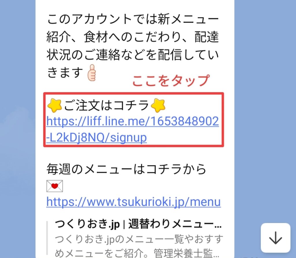 つくりおき.jpのLINEお友達登録を追加し、トーク画面に移動したら『注文はこちら』の下にあるURLをタップします。