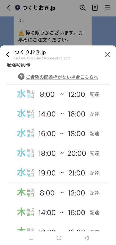 次に、つくりおき.jpの配送希望曜日と時間を設定していきます。