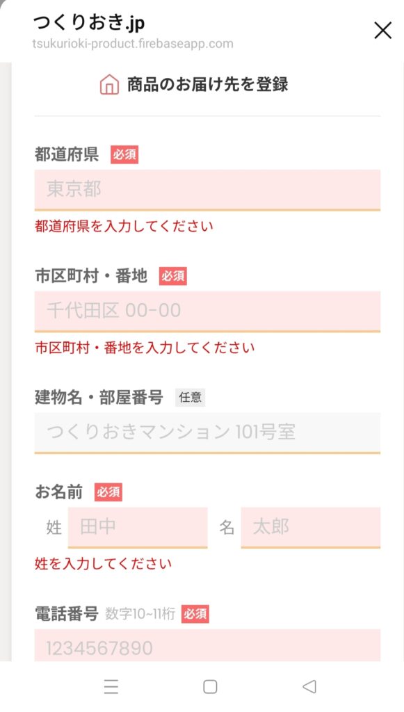 サービス提供エリアだった場合、お届け先情報を登録する画面が表示されるので、入力していきます。